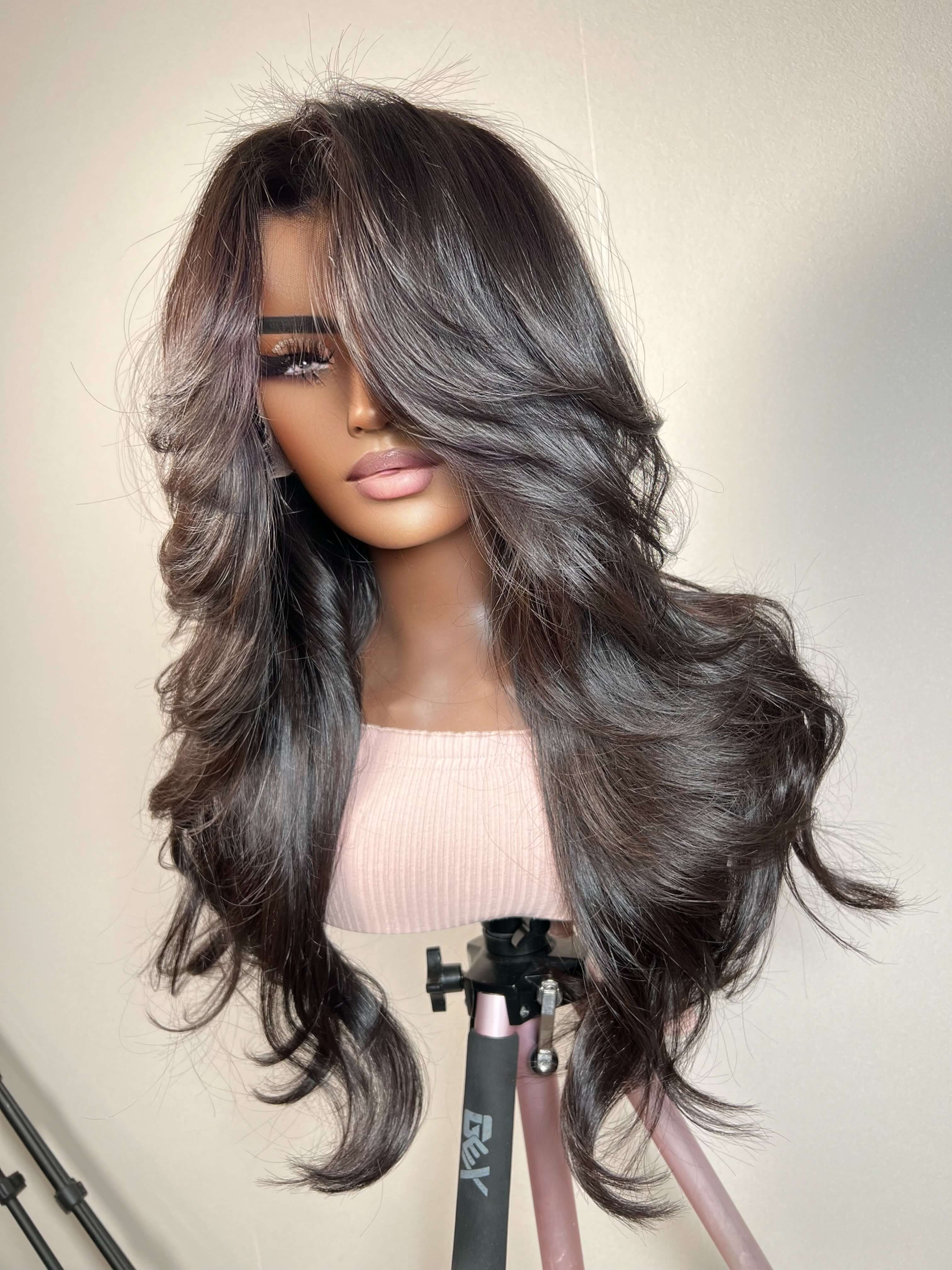 Tritt ein in eine Welt voller Eleganz, Stil und purer Extravaganz! Mit Glamour verwandelst du jeden Moment in einen atemberaubenden Auftritt. Diese luxuriöse Perücke wurde speziell für diejenigen entworfen, die sich nicht mit Mittelmaß zufriedengeben, sie ist ein Statement, ein Ausdruck von Selbstbewusstsein und unvergleichlichem Glamour.